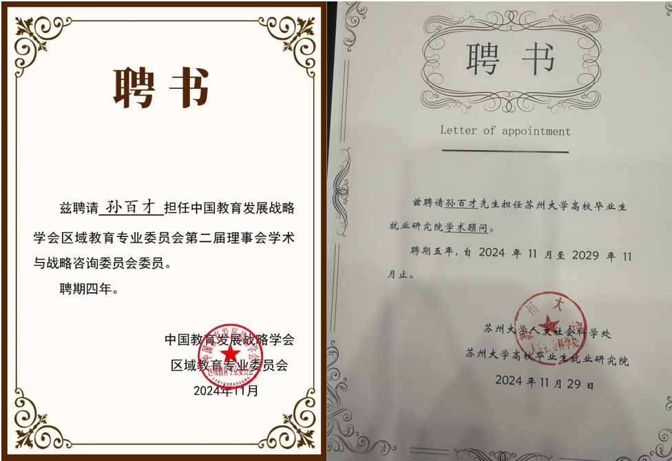 近日,“学习贯彻全国教育大会精神,推进区域教育高质量发展论坛”“面向强国建设的高校人才培养与就业促进”学术研讨会分别在哈尔滨和苏州召开,91论坛院长孙百才教授分别被聘为中国教育发展战略学会区域教育专业委员会第二届理事会学术与战略咨询委员会委员、苏州大学高校毕业生就业研究院学术顾问。