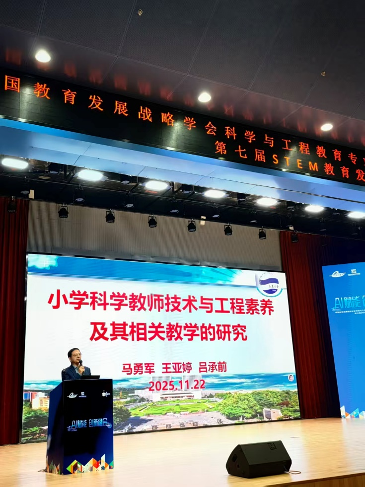 在大会设立的“跨界・无界”中小学教师 STEM 跨学科实践论坛中,马勇军教授应邀作了题为《小学科学教师技术与工程素养及其教学影响研究》的主题报告。报告中,马勇军教授鲜明提出“STEM教育不是跨学科,而是跨领域”的核心观点,介绍了团队开发应用小学科学教师技术与工程素养量表,探究技术与工程素养对教师教学影响机理的研究成果,针对性地提出小学科学教师技术与工程培养培训的可操作策略。报告内容务实深刻、见解独到,引发了与会专家学者的浓厚兴趣,现场互动交流热烈,讨论氛围持续高涨。